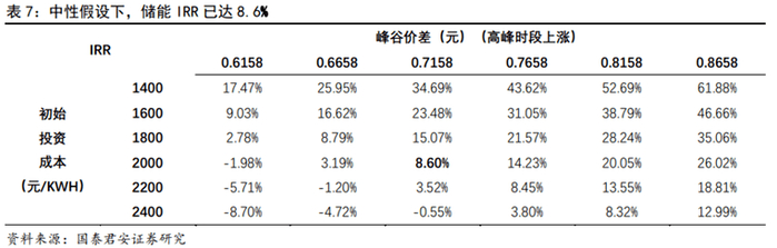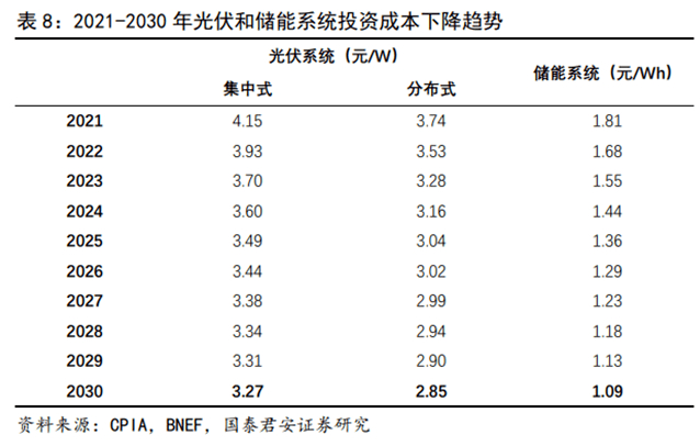 目前,各地依据本地情况出台配储比例政策,常见要求配储10%、2h(0.2wh)。长期来看,配储规模的增长弹性取决于光伏和储能装置成本的持续下价,理论上是维持光储一体化资产的合理IRR。我们按照2030年光伏和储能的成本测算,配储0.6wh的IRR可以达到6%。