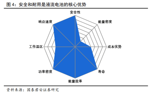 液流电池具备两大核心优势:1)安全:从根本上避免爆燃,2)耐用:活性物质衰减缓慢,工作寿命长达15-20年,加之储能系统一般是静态设施,对重量、体积的要求不高,能量密度并非关键指标,使得其尤其适合作为大规模储能系统。
