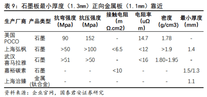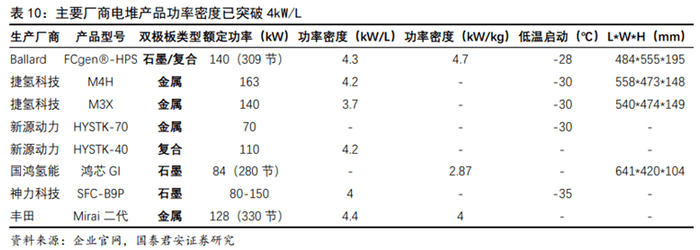石墨板适应需求趋于薄型化,乘用车为金属板带来机遇。石墨板:由于其高耐腐蚀性、高耐久性,以及相对较低的技术壁垒,率先实现国产化,在对体积较不敏感而对耐久性敏感的特种车、商用车领域示范应用。然而,石墨双极板的制作周期长、机械性能差、加工难度大、制作成本高等劣势也不可忽视。市场已有越来越多的企业成功开发出超薄超精细石墨双极板,提前突破了国家制定2025年前单组石墨双极板厚度1.5mm的要求,功率密度开始接近丰田第一代金属双极板的水平。金属板:抗腐蚀性差,寿命过短是其应用的阻碍,然而随着涂层工艺的持续进步与突破,其有望实现和石墨板相同的使用寿命。丰田汽车公司率先在旗下Mirai燃料电池汽车上使用金属双极板和涂层,解决了腐蚀、成本和导电等一系列问题。凭借其机械性能优异、高体积功率密度、成本低廉且易批量生产等优势,金属双极板将在乘用车规模化应用的进程中实现突破。
