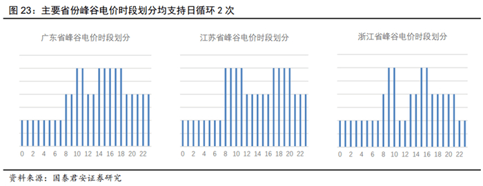 国内用户侧的峰谷电价差套利,我们认为主要体现在小工业和商业。按照地区分布,主要是长三角和珠三角。储能装置的经济性体现在两峰两谷(平),每天可以有效充放电两次的区域,比如广东、浙江、江苏等。