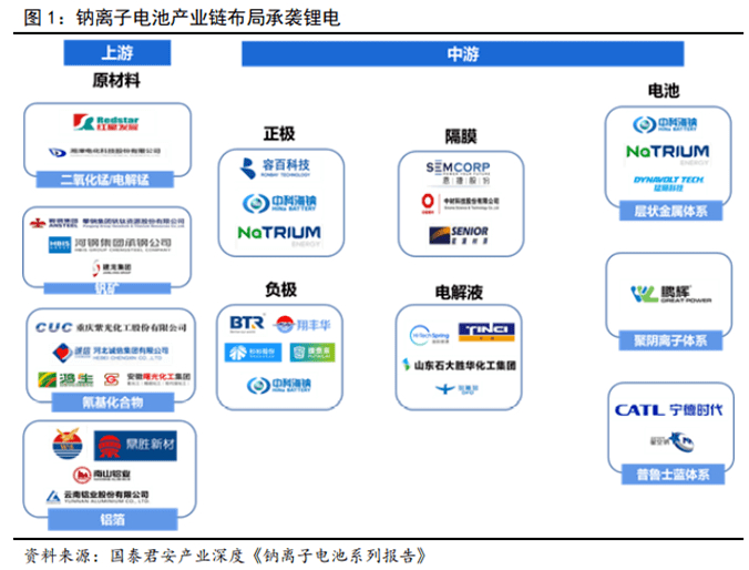 钠电产业链布局承袭锂电,利于产业化快速导入。我国钠离子电池产业链还处于初级阶段,产业布局尚不成熟。钠离子电池产业链结构与锂电类似,包括上游资源企业、中游电池材料及电芯企业。