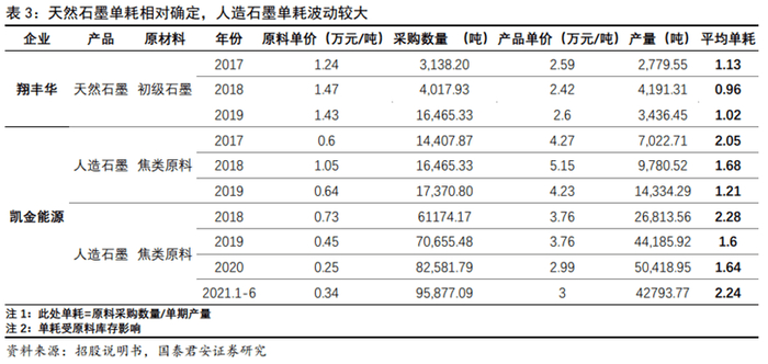 残碳率(单耗):石墨负极材料中,天然石墨单耗相对确定,人造石墨单耗波动较大,依据负极材料厂商披露的数据计算,单耗在1.21-2.28区间内。单耗可能随石油焦和针状焦用量的占比差异而有所变化,除高端人造石墨主要采用针状焦为主外,其余不同品质的负极材料原料用量的具体配比未知。硬碳/软碳负极中,酚醛树脂分子中含有大量的芳香环,残碳率高于其它高分子聚合物,理论值在55~70%,产业化后可能低于50%,原料单耗2以上;生物质原料的残碳率可能只有20%;无烟煤的残碳率大概50-80%,但软碳性能弱于硬碳。