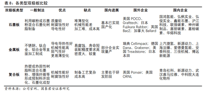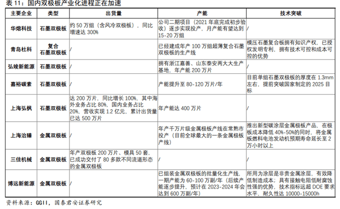 国内产业化进程正在加速:据GGII统计,2021年期间,国内主流双极板企业出货量增长显著,金属双极板领域已出现单个企业单个客户出货达百万片级别的现象;石墨板市场各家出货也均有较大增长,表现明显的是原万片级出货企业的出货量级达到10万片以上,头部企业的出货更是达到了50万片/年以上。