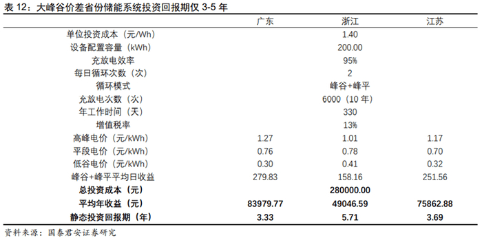 国内展望:用户侧的经济性体现在峰谷电价差和充放电次数。国内用户侧的峰谷电价差套利,我们认为主要体现在小工业和商业。按照地区分布,主要是长三角和珠三角。储能装置的经济性体现在两峰两谷(平),每天可以有效充放电两次的区域,比如广东、浙江、江苏等,按照我们的测算, 广东、浙江、江苏三省储能系统投资回报期仅3-5年。