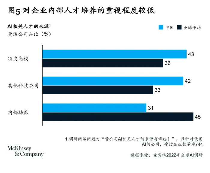 AI人才一般来自高校、其他科技公司以及内部培养等。从调查结果来看,中国公司更愿意从顶尖高校和其他科技公司挖掘人才,而对于内部人才培养的重视程度不足。约30%的中国公司会依靠内部培养获取AI人才,远低于45%的全球平均水平。而内部人才对于公司业务、流程与组织架构更加了解,将内部人才转型成为人工智能转译员,通常有利于减少沟通成本,更有效地推进AI技术的落地实施(见图5)。
