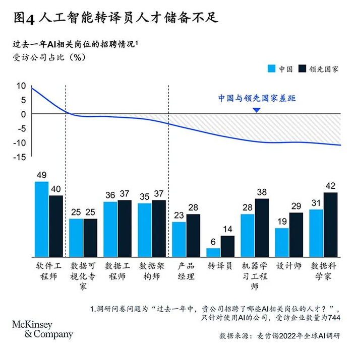 AI相关的岗位主要包含软件工程师、数据工程师、数据科学家、数据架构师、产品经理和转译员等。其中,人工智能转译员的角色尤为重要,因为他们知道应该提出哪些业务问题,并将业务问题“翻译”成人工智能解决方案。这一群体掌握的技能好比希腊字母π,他们不仅广泛掌握通用管理技能(横线),而且在人工智能和业务领域也具备深厚的专业知识(两条竖线)。调查结果显示,中国企业一般更注重软件工程师和数据工程师等技术职位的招聘,而诸如人工智能转译员和设计师等多元化人才则重视不足。过去一年中,近一半的中国企业招聘了软件工程师,但只有6%的企业招聘了转译员(同期领先国家企业占比为14%)。业务“翻译”人才的不足会影响中国公司对于AI技术的理解与应用,从而削弱AI带来的业务成效与变现价值(见图4)。