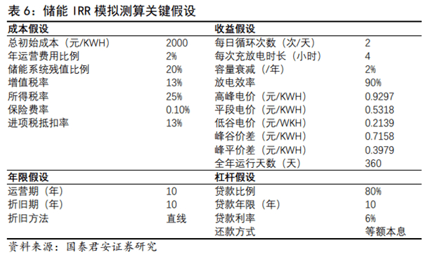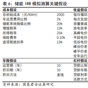 目前,各地依据本地情况出台配储比例政策,常见要求配储10%、2h(0.2wh)。长期来看,配储规模的增长弹性取决于光伏和储能装置成本的持续下价,理论上是维持光储一体化资产的合理IRR。我们按照2030年光伏和储能的成本测算,配储0.6wh的IRR可以达到6%。