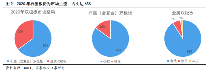 市场格局:仍以石墨板为主,金属板或后来居上。氢燃料电池方面,2020年我国氢燃料电池双极板市场规模达3.1亿元,石墨板(包含碳塑复合板)和金属板的市场占比分别为65%和35%,2021年石墨双极板与金属双极板趋于平分秋色。GGII数据显示,2021年H1金属双极板出货量在双极板总出货量的占比已达45.0%(2020年同期为36.0%)。钒液流电池方面,基本不考虑金属板,即使是涂层处理后的金属板,在酸性液体环境中也难以长期稳定工作。石墨双极板(机加工)不被看好,因为其机加工过程复杂且成本高。钒液流电池主要采用碳塑复合板,因为其热塑或模压工艺相对机加工简单,但是混合高分子树脂所带来的电阻率增加仍是需要解决的问题。