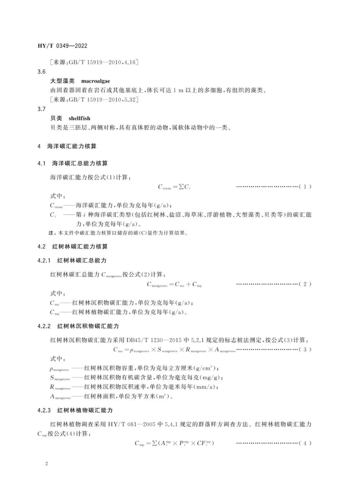 海洋碳汇术语和定义是海洋碳汇核算的基础前提。《海洋碳汇核算方法》行业标准将海洋碳汇定义为“红树林、盐沼、海草床、浮游植物、大型藻类、贝类等从空气或海水中吸收并储存大气中的二氧化碳的过程、活动和机制”,明确了发挥碳汇作用的主体是红树林、盐沼、海草床、浮游植物、大型藻类、贝类等,同时强调了碳汇过程是“吸收并储存”的过程。此外,为便于理解和后续应用,对海洋碳汇核算涉及的其他相关概念也进行了逐一界定。