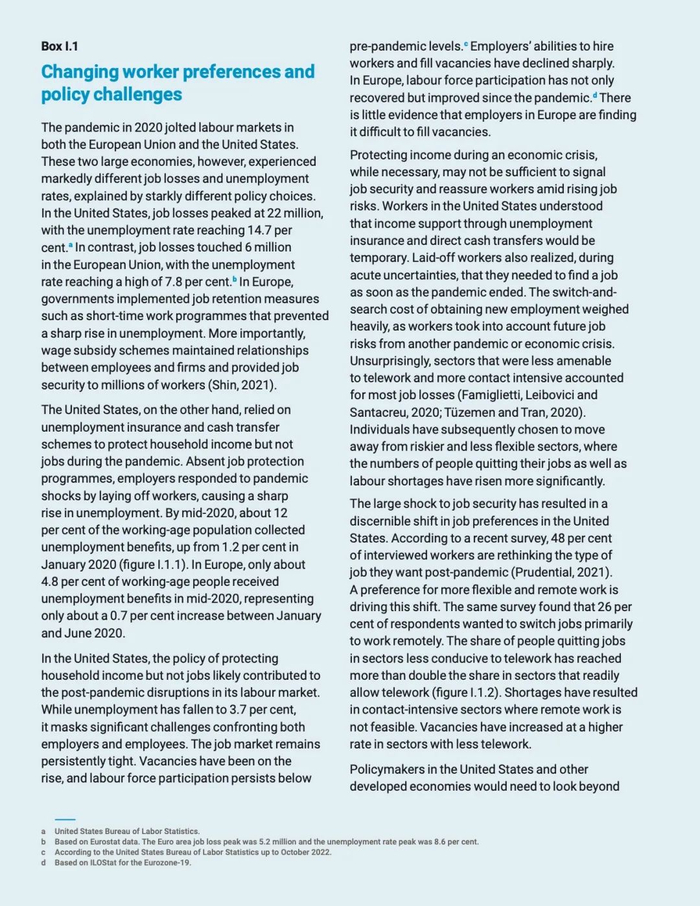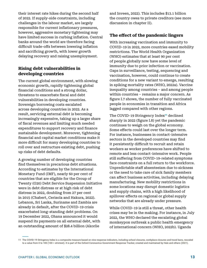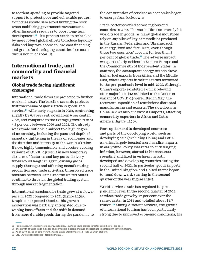 2022 年,一系列相互影响的严重冲击,包括新冠疫情、俄乌冲突及其引发的粮食和能源危机、通胀飙升、债务收紧以及气候紧急状况等,导致世界经济遭受重创。美国、欧盟等发达经济体增长势头明显减弱,全球其他经济体由此受到多重不利影响。