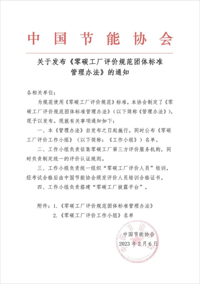 中国节能协会发布了《零碳工厂评价规范团体标准管理办法》并公示了“零碳工厂评价小组”,并确定小组下一步工作方向。