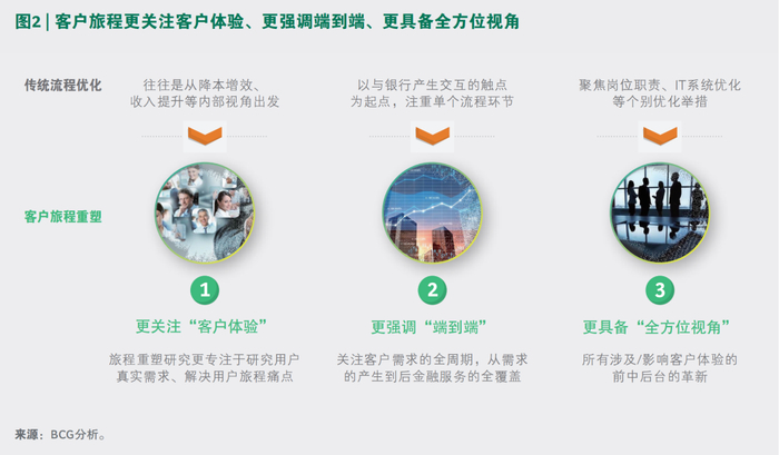 不同于传统流程优化,客户旅程更关注客户体验、更强调端到端、更具备全方位视角(参阅图2)。