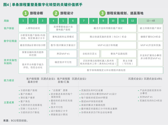 单条旅程重塑能够立竿见影地创造价值,是数字化转型的关键价值抓手。单条旅程重塑工具组基于BCG 90天旅程重塑方法论,可帮助银行在三个月内完成单条旅程的诊断、设计与实施规划,并通过速赢见效,实现试点期业务价值的落地。针对方法论中的每一环,BCG都有经过实战检验的丰富工具模板与行业最佳实践,全方位助力银行重塑旅程(参阅图4)。