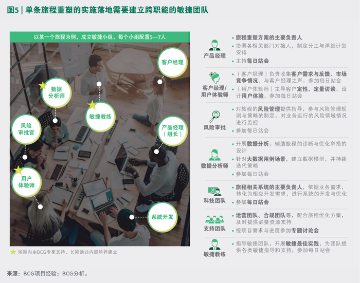 端到端客户旅程涉及多个部门,卓越客户体验的交付需要前中后的联动与配合。为避免“铁路警察,各管一段”的情况出现,旅程重塑由跨职能敏捷团队来推进落地。团队以回应客户需求为核心,以交付价值为导向,小步快跑,敏捷迭代。团队成员需覆盖旅程端到端的所有职能,如产品经理、客户经理、用户体验师、风险审批(信贷相关)人员、数据分析师、科技人员、运营人员、合规人员(参阅图5)。