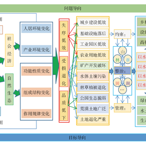 基于系统论认知,一个完整的生态系统包括要素、连接、功能三个方面,当生态系统出现状况,单一解决要素问题,问题就会反复出现,要根治问题,就必须要从生态系统的连接和功能上探索问题解决的途径。山水林田湖草沙等自然要素形成完整的生态系统,各要素命脉相连、彼此依存,其中一方受到影响和破坏,其他各方必然会被牵涉。那么,在西北干旱区山水林田湖草沙生命共同体的相互关联作用关系是怎样的?如何实现系统治理?这些问题要从国土空间的自然资源和社会经济要素的运行导向、问题导向和目标导向三个维度进行阐释(图1)。从运行导向来看,西北干旱区是以山为骨架、水为脉络、林田湖草沙为肌体。山是西北干旱区水资源与降雨径流的主源地,具有涵养水源功能,其功能发挥主要依靠山上地被的林地和草地。水滋养孕育着西北干旱区林、田、湖、草,为其生存提供必要的物质基础,是西北干旱区整个生态系统中联系各要素的桥梁和纽带。在自然过程(地质地貌作用、生物进化演替、植被演变等过程)和人类社会(对自然界的开发利用改造过程)等共同作用下,山、水、林、田、湖、草、沙各要素组成一个有机的生态系统,为人类生存发展提供优美的自然环境和优良的物质基础。从问题导向来看,随着西北干旱区人类活动对自然界的影响不断加深,对自然过程的干预也变得越来越剧烈,尤其在人类对自然界不合理开发利用活动的负向作用下,导致国土空间开发利用失序低效、受损退化、品质低下等一系列问题,例如,矿产资源开发导致山体、地形地貌和植被被破坏,从而对水也产生影响,引发水土流失、土地沙化荒漠化等,危害着人类社会与自然的可持续发展。从目标导向来看,新时期聚焦生态文明建设、乡村振兴、可持续发展等国家战略,国土空间开发保护新格局要把“生态优先、保护优先、绿色发展”摆在突出位置,旨在建构“生产空间集约高效、生活空间宜居适度、生态空间山清水秀”的国土空间结构与布局,促进生产、生活、生态“三生”有机共融,实现人与自然和谐共生与可持续发展。