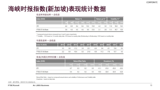凭借其具防御性的构成和较高的股息收益率,海峡时报指数(新加坡)在2022年的市场动荡中展现出相对的弹性。如图所示,富时发达市场指数在2022年表现最差,富时亚太区发达市场指数的业绩也出现两位数的跌幅。富时东盟指数(由五个东盟国家的股票组成,其中新加坡的权重占比超过30%)实现了以美元计算2.5%的正回报。