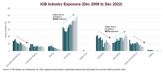 今天,海峡时报指数(新加坡)STI反映了新加坡正在向亚洲顶级金融中心之一转型。该指数最大的三只成分股是新加坡排名前三的银行,它们合计占指数的47%。因此,金融在海峡时报指数(新加坡)的行业组成中权重最大,其次是房地产——反映了该指数对REITs的敞口随着时间的推移而增加。