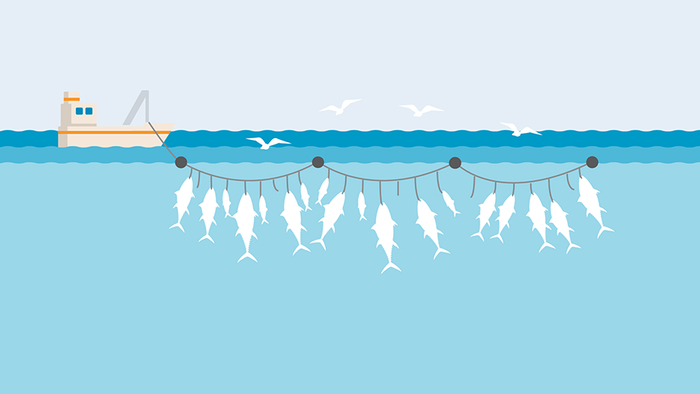 ▲ 延绳钓:船后拖着一根鱼绳,绳上每隔一定距离系着一个带饵钓钩。图片来源:Marine Stewardship Council