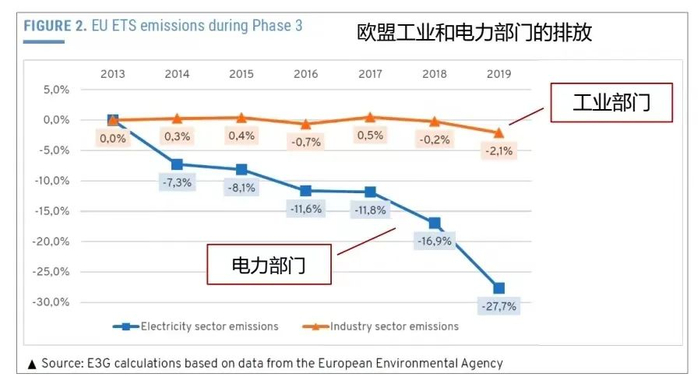 从2013年开始,欧盟碳市场变得“严肃”起来,取消了给发电行业的免费配额,但是工业部门仍然可以获得免费配额,因为绝大部分工业部门都被认定为存在“碳泄漏”风险。如果CBAM不出现的话,这些部门在2031年之前都可以按照行业排放标杆的100%获得免费配额。既然企业不必为了排放去购买配额,自然就失去了脱碳减排的动力。免费配额的“超发”,严重削弱了欧盟碳市场的价格信号和刺激减排的功用,是欧盟工业脱碳的负动力。相比之下,欧盟的电力部门自2013年取消免费配额以来,减碳成效显著。当然,电力部门减碳相对简单,不可完全归功于取消免费配额。