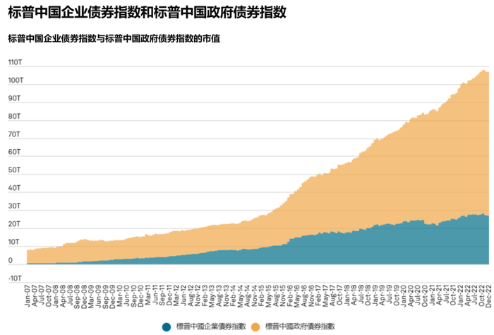 中国政府债券包括中国主权债券、政府票据、中国政策性银行债券和中国省级债券。在过去十年中,中国的企业债券市场经历强劲增长,目前占标普中国债券指数成份的36%。企业债券代表的行业为金融、服务、公用事业和工业。