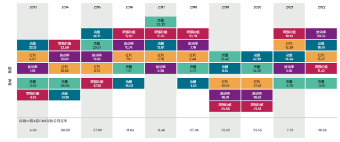 来源: 标普道琼斯指数有限公司。数据截止2022年12月31日。因子指数基于标普中国A股指数。过往表现并不能保证未来业绩。附表仅供说明,反映了假设的历史表现。