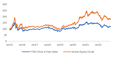 Source: External Database, FTSE Russell, as of 20221231; including active equity funds, aggressive allocation funds and passive equity funds