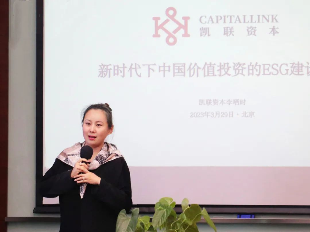 李哂时以“新时代下中国价值投资的ESG建设之路”为主题,从“党的二十大”以及“两会”中的ESG内容、行业ESG政策与投资机会、凯联资本如何积极践行ESG投资理念三方面展开介绍。她指出凯联资本专门设置了ESG委员会,将ESG投资理念渗透到项目投资的各个流程中,覆盖了从项目初筛,到尽职调查,再到投委会和风控部门最终把控,以及投后管理等环节,坚持价值投资和。同时,联手LP和被投企业,共同关注ESG理念,并在慈善领域保持支出。她表示希望日后同学们也能在工作或者投资决策时贯彻ESG理念,让世界变得更加美好。