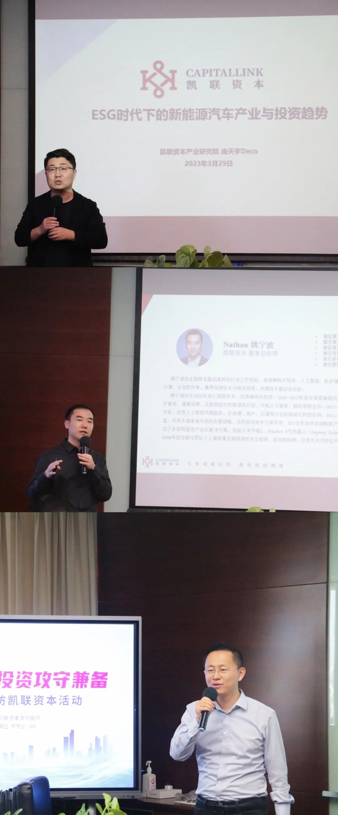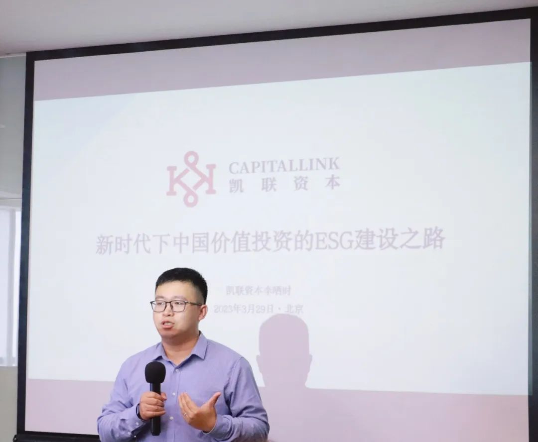 为推进校企协同育人、积极推进学生职业能力的提升、培养ESG领域的专业人才,2023年3月29日下午,ESG精英训练营组织全体营员前往凯联资本进行企业参访活动。凯联资本创始合伙人/CEO、ESG精英训练营校外导师李哂时,凯联资本产业研究院院长由天宇,凯联资本董事总经理姚宁波,凯联资本董事总经理姬可鹏为营员们做了详细的介绍,凯联资本合伙人张宁出席了活动,工商管理学院企业可持续发展系主任、首都经济贸易大学中国ESG研究院评价研究中心主任王凯作为负责人带领ESG精英训练营学生30余人参与了此次企业参访,工商管理学院专职辅导员韩琦,ESG精英训练营班主任李明雪、学生工作助理李锦一同参与了此次活动。参访活动由孙盼主持。
