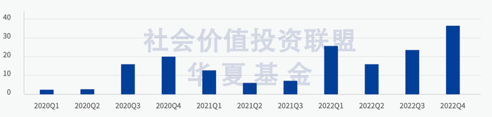 2022年,私募股权投资基金领域的ESG实践明显提速。截至2022年9月底,中国内地私募基金机构中共有PRI签署机构47家,其中2022年签署的就有17家,占近四成。新签署PRI的私募基金机构中不乏管理国资背景机构和管理规模50亿元以上者,可以预见未来ESG投资更广泛地影响到多层次资本市场的发展。