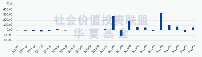 从基金份额方面看,在经历2021年的发售高峰期后,中国内地各类ESG主题基金份额变化在2022年趋于稳定,前三季度累计净增79.01亿份,也因此推断出ESG主题基金总规模下行可主要归因于单位净值的下降。