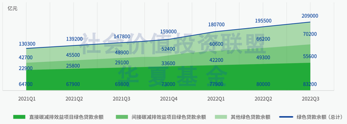 可持续信贷规模稳健增长,新型产品渐次落地。绿色贷款方面,截至2022年9月底,国内本外币绿色贷款余额达到20.9万亿元,较上一年末的15.9万亿元增长31.4%;2022年前三季度新增绿色贷款规模持续上升,共计新增10.46万亿元。数据显示,2021年以来,国内直接和间接碳减排效益项目的绿色贷款余额持续增长,其中间接碳减排效益项目的绿色贷款余额增长较快,二者之和占总绿色贷款余额比例稳定在67%左右(见图表 12)。