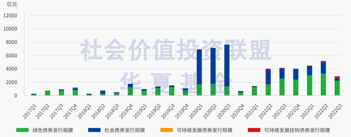 近年来,国内可持续主题债券市场保持高度活跃。根据Wind提供的数据,截至2022年9月,各类可持续主题债券(包括:绿色债券、社会债券、可持续发展债券、可持续挂钩债券)[4]累计发行总规模达65283.35亿元,其中绿色债券规模约占五成。2022年前三季度,绿色债券发行迎来新高潮期,发行规模达8907.09亿元,超过2021年总和;社会债券发行规模次之,达3327.45亿元。