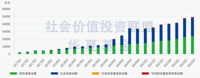 可持续主题债券余额方面,2017年以来整体呈上升趋势。截至2022年9月底,中国境内可持续主题债券余额超过4.8万亿元,较上一年底增加20.2%,其中绿色债券和社会债券占据主要地位,分别占比47.40%和50.69%。此外,近年来新兴的可持续发展挂钩债券的债券余额增量明显,从2021年的353亿元增至2022年9月底的909.9亿元,增幅达157.8%。