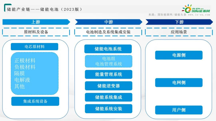 储能电池产业链可分为上游材料及设备、中游电池制造及系统集成安装、下游应用。