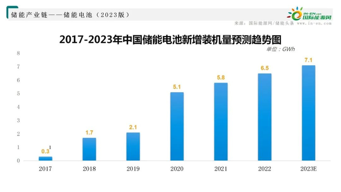 受益于电池成本的持续下降和政府政策的刺激,我国储能电池在2017年0.3GWh新增投入运营的装机量的基础上,于2021年实现了5.8GWh的新增装机量,2017-2021年我国储能电池新增装机的年均复合增长率高达109.7%。在国家能源转型及碳中和战略背景下,储能电池是电力系统改革和新能源电力建设的重要组成部分,预计到2023年将达7.1GWh。