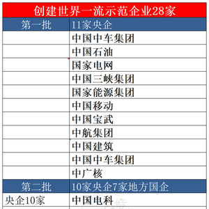 28家央企及地方国有企业创建世界一流示范企业如下: