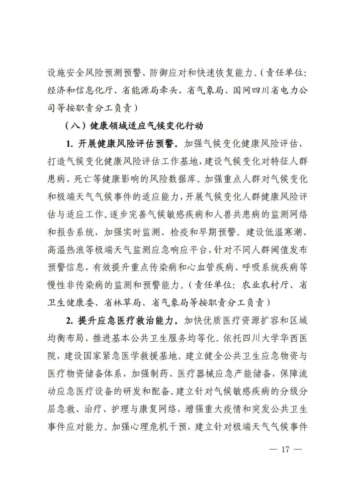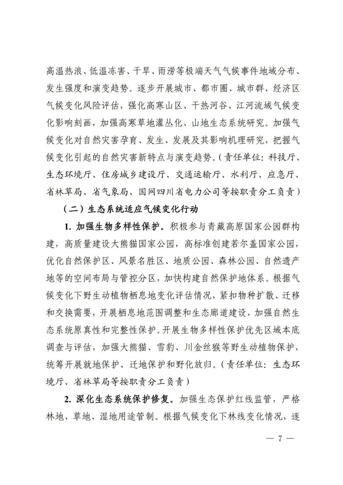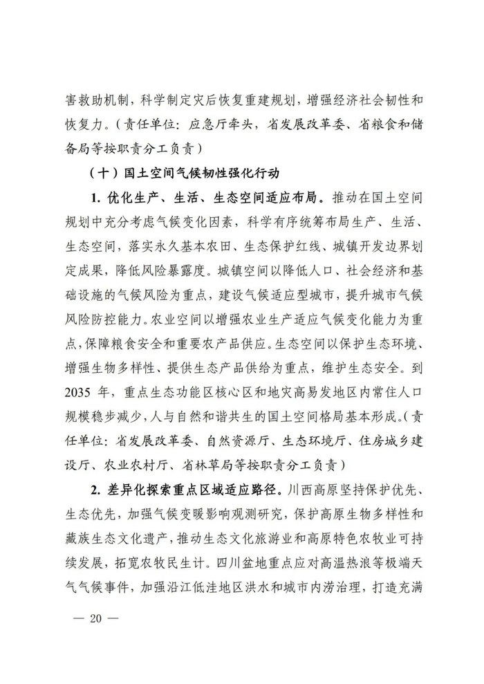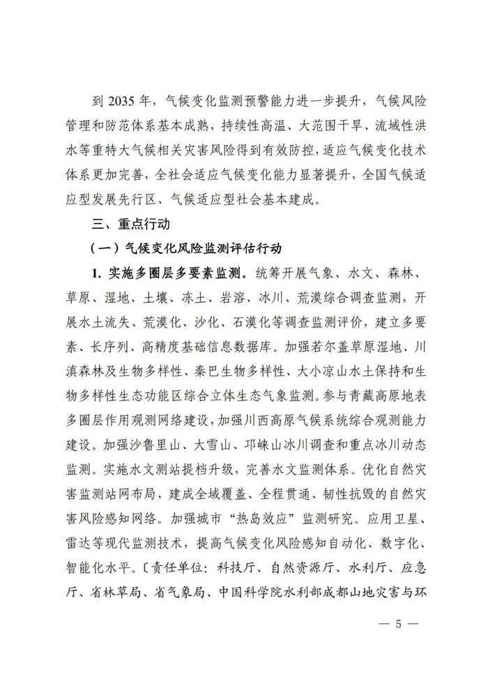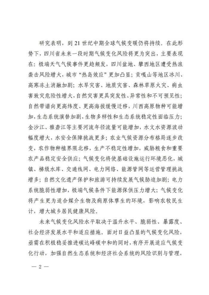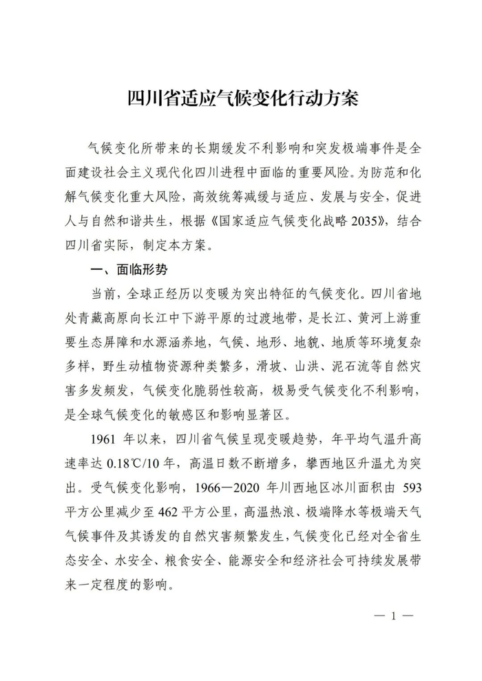 为防范和化解气候变化重大风险,高效统筹减缓与适应、发展与安全,贯彻落实《国家适应气候变化战略2035》《省级适应气候变化行动方案编制指南》要求,我省组织编制了《四川省适应气候变化行动方案》。现予以印发,请结合实际抓好落实。