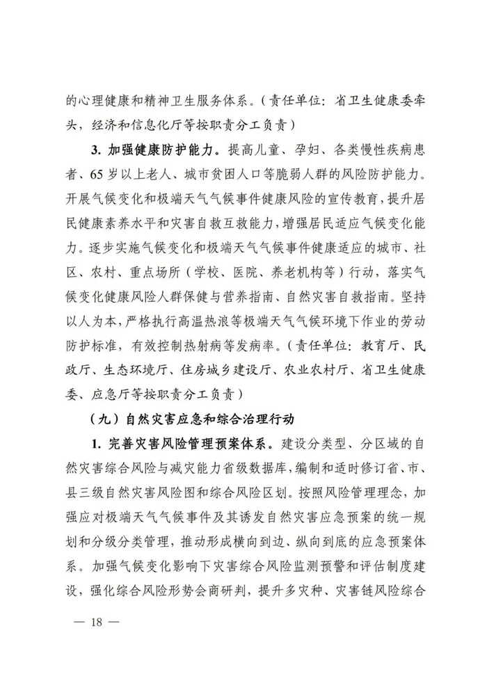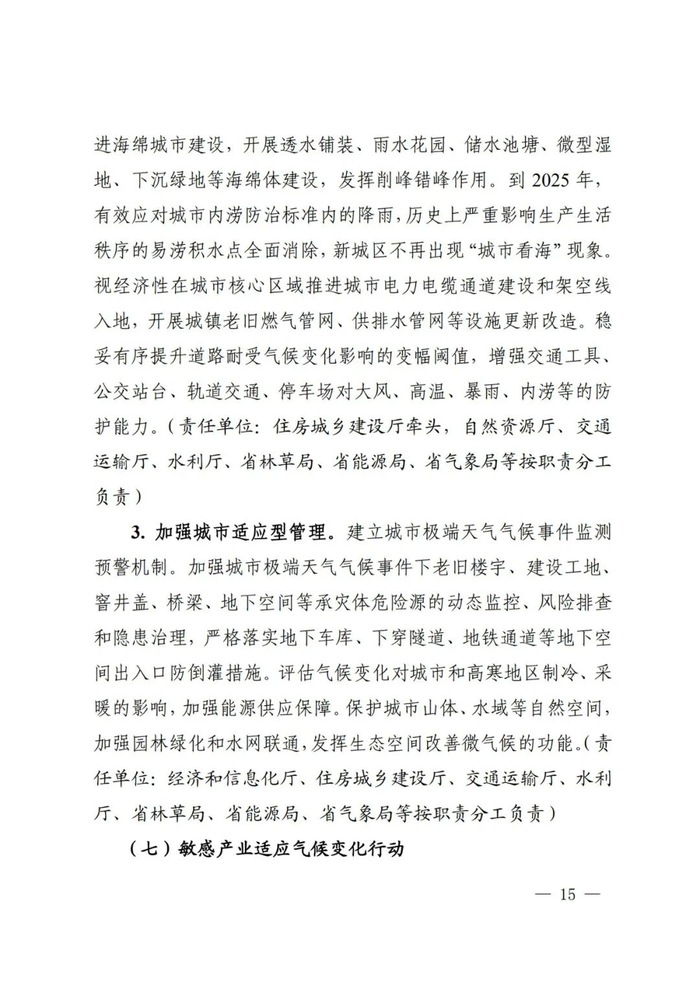 其中,要求健全适应气候变化协调工作机制,形成适应气候变化政策行动合力。构建有利于应对气候变化的财政政策体系,引导金融机构投资适应气候变化项目建设。加强监测预估、风险评估、损失损害等基础性综合性研究,促进适应技术转化和推广。推动重点领域、重点地区、重点环节探索开展适应气候变化试点示范,打造一批气候韧性“细胞单元”。培养高水平复合型人才,加强适应气候变化基层人才队伍建设。广泛开展形式多样的宣传和科普活动。强化与流域上下游地区、毗邻省(市、区)的合作,加强适应科技创新国际交流。