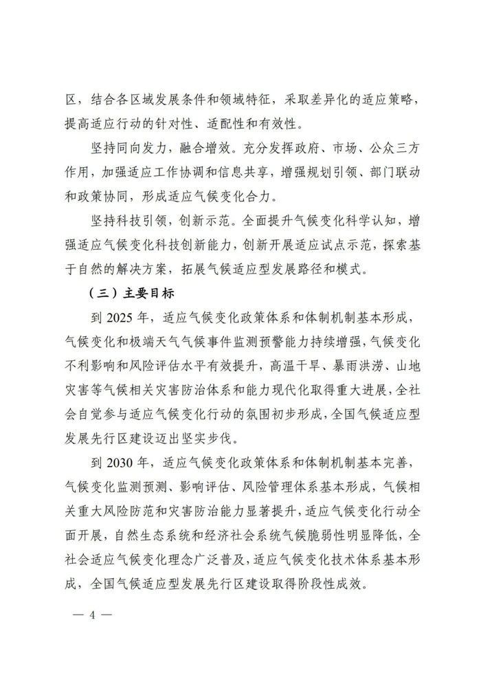 四是同向发力,融合增效。充分发挥政府、市场、公众三方作用,增强规划引领、部门联动和政策协同,形成适应气候变化合力。