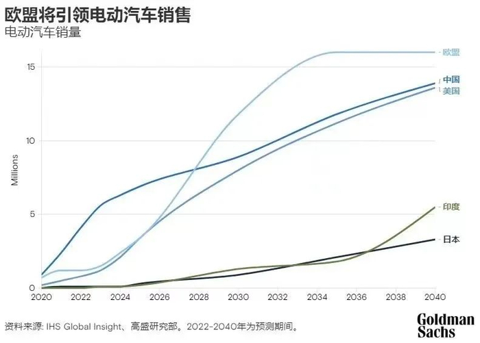 此外,2027年启动EU ETS II,道路交通和建筑部门建立碳市场后,将进一步带动包括分布式光伏、电动车、充电与储能设施市场扩大,中国企业应尽早考虑在欧洲投资建设生产基地。以电动车为例,根据高盛研究部预测,2027年后欧盟将超过中国,成为全球最大的电动车市场。