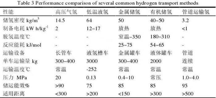 有机液体以及氨气输运氢气也是正在开发的氢气储运方法,尤其是在长距离、大规模的氢气输送方面具有一定优势,但是杂质气体含量高,高纯氢气使用时需要重新纯化。固态合金输氢纯度高、安全性好,但是输运能耗高、成本高,适合人口密集高的区域以及短距离的氢气输运。图4是三种主要输氢方式价格与距离的变化。长管拖车输运氢气成本随距离的增加显著,适合300km以内的输氢,距离超过300km时,液氢和管道输氢更合适,输氢量越大,这种趋势越明显。表3是不同输氢方法所对应的一些参数。