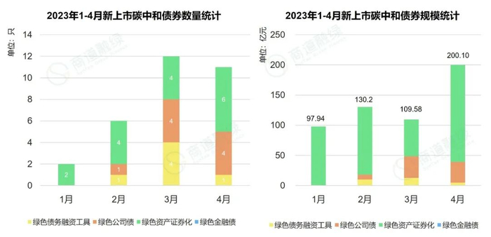 2023年4月,境内新上市碳中和债券11只,规模为200.10亿元,数量及规模在绿债市场中的占比分别22.00%、17.51%。