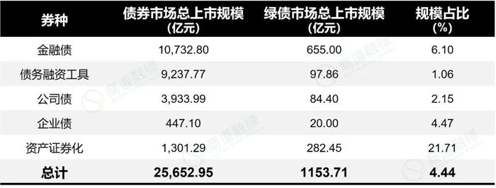 4月份,债券市场3总上市规模为25652.95亿元,绿债市场总上市规模为1153.71亿元,规模占比为4.44%。其中,资产支持证券占比最高,为21.71%。