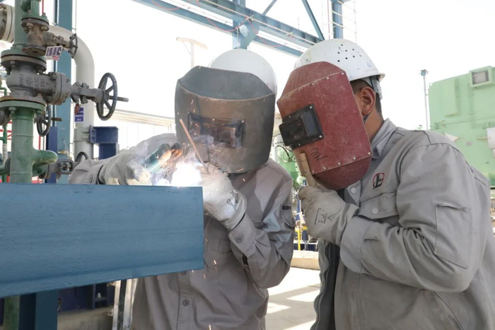 5月16日,在中国石化新疆库车绿氢示范项目电解水制氢装置施工现场,施工人员正加紧施工,最行最后的仪表连接、管线防腐、辅助设施修复等收尾工作,为5月30日全套设施进入试生产做冲刺。
