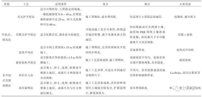表2 PRB 的不同施工工艺及适用条件、优缺点及主要设备
