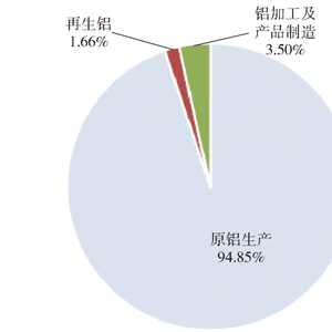 铝行业包括原铝生产(铝采矿开采、氧化铝生产、阳极生产、电解铝生产)、再生铝及铝加工及产品制造等产业链,其中原铝生产CO2排放量约占铝行业CO2排放量的94.85%,见图2。