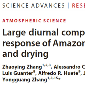 上述研究成果近日以"Large diurnal compensatory effects mitigate the response of Amazonian forests to atmospheric warming and drying"为题,发表在国际顶级刊物Science Advances上。南京大学章钊颖助理教授为第一作者,张永光教授为通讯作者。