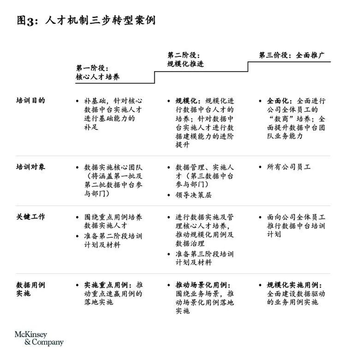 搭建管理机制和培养人才“数商”是数据中台成功的必要条件。要确保数据中台政策运作,必须识别及培养数据中台所需人才、搭建匹配的管理组织和明确权责、关注科技内部及跨部门协作机制搭建,并充分考虑含安全升级、分级分类等在内的安全合规(见图3)。