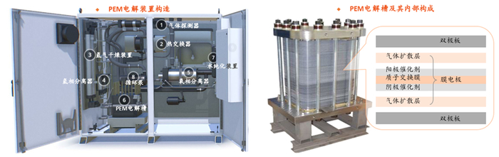 •质子交换膜电解(PEM)是对纯水进行电解,H2O分子在阳极氧化生成氧气和H+离子,H+(质子)在电场作用下通过质子交换膜迁移至阴极并发生还原反应生成氢气的方法。