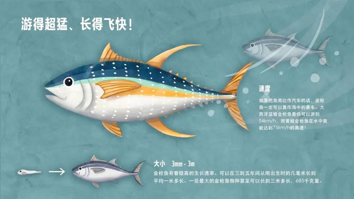 黄鳍金枪鱼是一种高度迁徙的洄游鱼类,被誉为“大洋中的精英”。成鱼呈鱼雷形,背部呈深金属蓝色,有很长的臀鳍和背鳍,以及亮黄色的小鳍。它们是海洋中的顶级掠食者,以小型鱼类、头足类和其他无脊椎动物为食。
